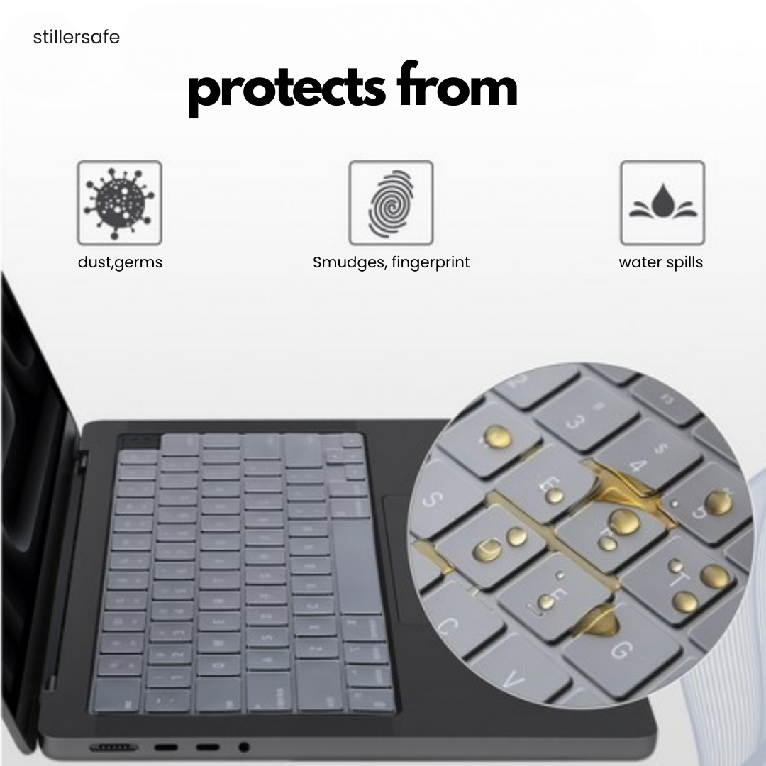 Compatible Models - StillerSafe keyboard cover is designed to be compatible with the Macbook 2022–2025 MacBook Air 13.6 inch M2 M4 M3 A3240 A3113 A2681, 2023–2025 MacBook Air 15 inch M2 M4 M3 A3241 A3114 A2941, MacBook Pro 14 inch M4 M4 M3 M2 M1 2021–2024 A2779 A2442 A2992 A2918 A3112 A3401 A3185, and MacBook Pro 16 inch M4 M4 M3 M2 M1 2021–2024 A2780 A2485 A2991 A3403 A3186. Please make sure to check your keyboard layout before making a purchase.